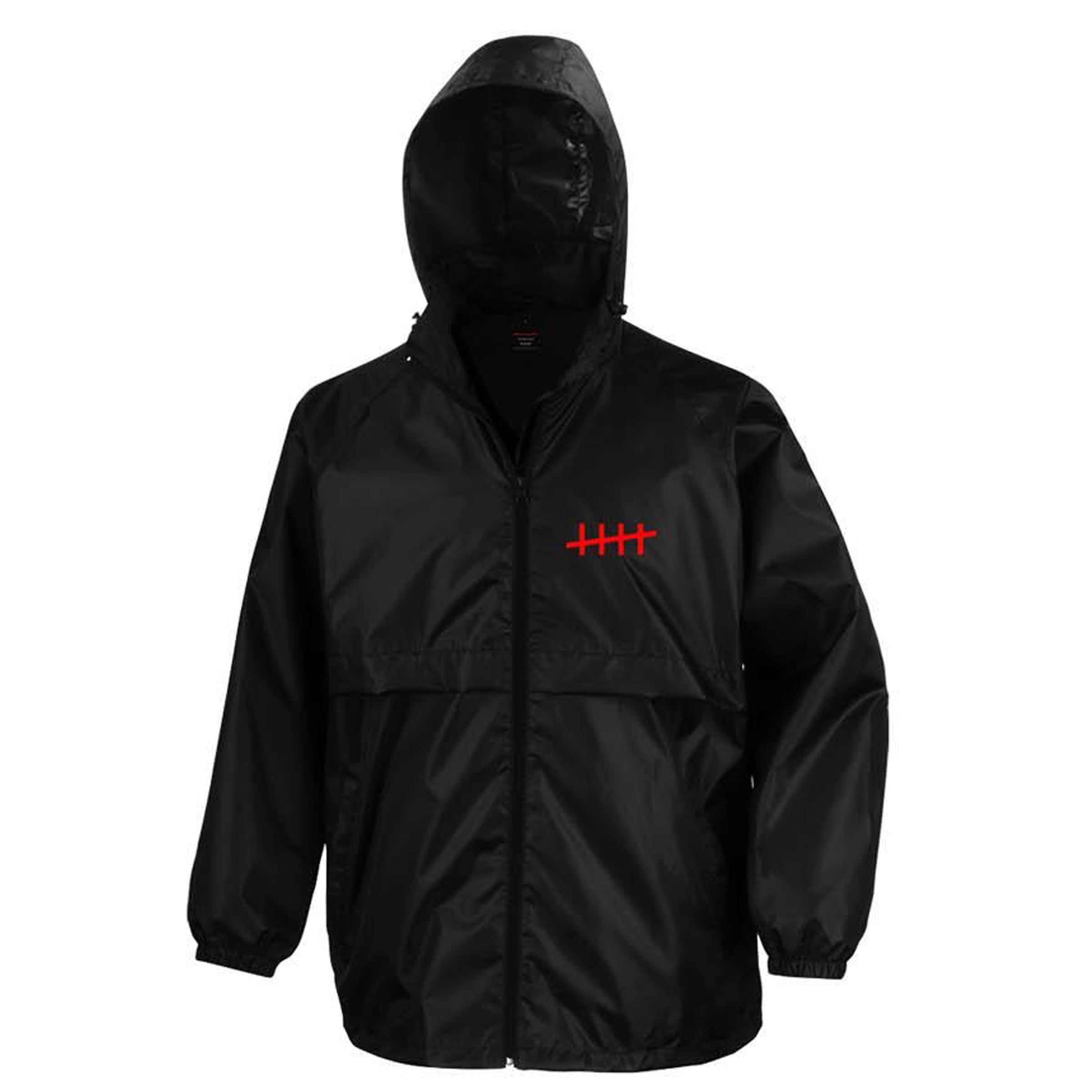 Includes the windbreaker. Lightweight with hood (retracts into collar), front and back print, pocket with a zip.